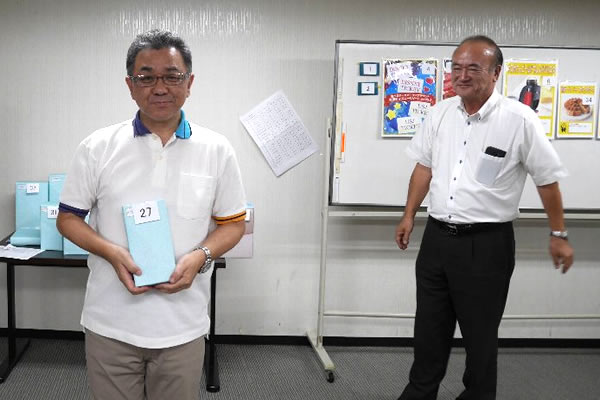 ゲーム後の表彰式はサンドイッチと飲み物が用意された中、進められました。団体戦の成績発表3位(下記を参照)までの表彰の後、個人戦の表彰が行われ、河内労福協の恒例となっている成績順に良い景品が貰えない、成績の上位者からくじを引く権利が与えられる抽選会方式で行われました。